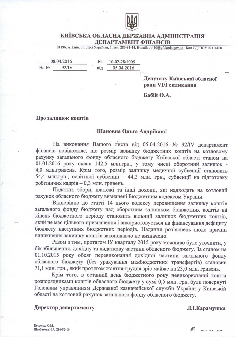 В четверг, 21 апреля, на сайте Киевского областного совета вышло интервью главы бюджетной комиссии Киевского областного совета Ольги Бабий, в котором главный финансист коллегиального органа Киевщины раскритиковала работу департамента финансов КОГА. По её словам, облгосадминистрация как распределитель регионального бюджета не выполняет свои обязанности своевременно, из-за чего остатки свободных средств не используются, “зависая” на счетах.