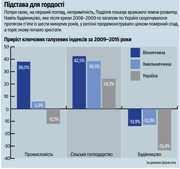 По состоянию на 2014 год и Винничина, и Хмельнитчина превысили уровень производства сельхозпродукции 1990-х годов (на 12% и 4% соответственно), чего не удалось сделать в целом по Украине ни в этой области, ни в большинстве других. Это свидетельствует, что на Подолье агробизнес не просто восстанавливает утраченные после обретения Украиной независимости позиции, а стремительно развивается. Для таких процессов нужны совсем другие условия ведения дела, ментальность, подходы, чем при “просто” восстановлении потерь.
