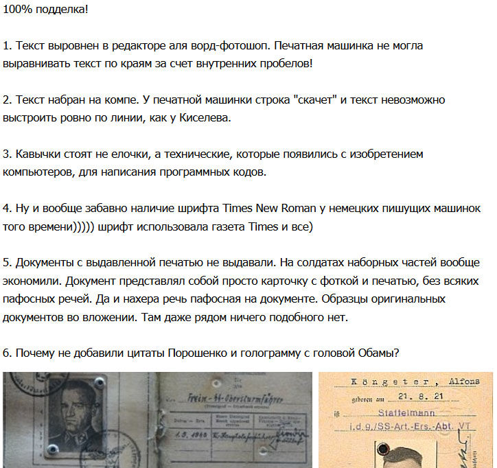 Пользователи сети обратили внимание, что цитата написана с большим количеством ошибок. Кроме того, на фото у Киселева в билете стоит фотография не украинца, а Вальтера Шмидта - оберштурмбанфюрера СС.