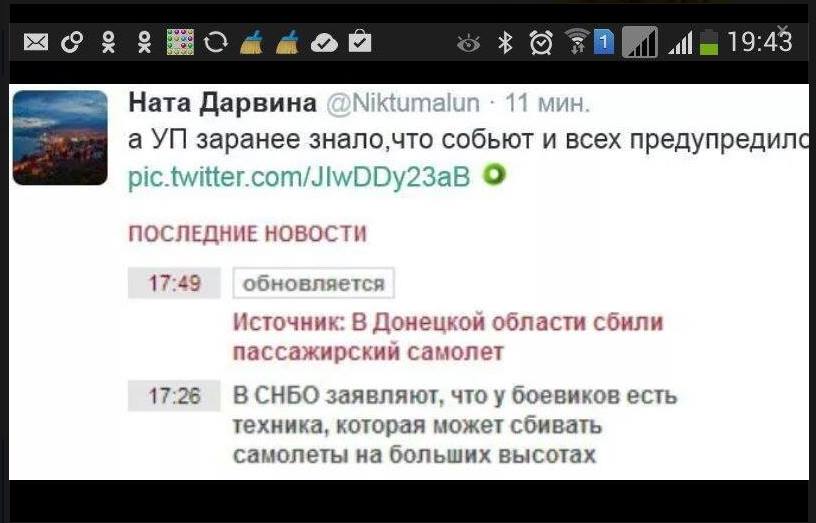Сообщение утверждает: «В Донецкой области был сбит пассажирский самолет, который шел в направлении Куала Лумпура. Погибли 280 человек и 15 членов экипажа. Об этом "Украинской правде" сообщили источники.
