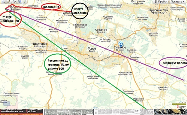Данные объективного контроля указывают на нахождение украинского ЗРК БУК-М1 около г. Шахтерск, как и системы РЛС. От Шахтерска до Кировского – 15 км. Сейчас многие украинские СМИ распространяют информацию, что самолет мог быть сбит из Шахтерска только в том случае, если он летел задом наперед. Об этом якобы свидетельствуют следы от шрапнели на кабине пилота (спереди самолета).