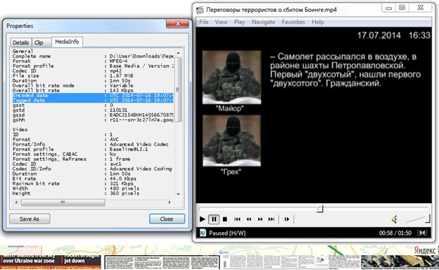 Запись сопровождается титрами. Из записи следует, что в 16:40 по местному времени (17:40 мск) полевой командир Безлер в разговоре с полковником ГРУ Василием Гераниным сообщил об уничтожении около 30 минут назад "группой Минера самолета в районе Енакиево".