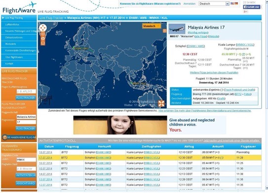 - Около 20:00 МСК пришла информация об обнаружении места катастрофы, первые фото и видео с места трагедии, где были видны обломки самолета, следы пожара, тела пассажиров, их паспорта, вещи и пр. В сообщении указано, что «Вызов в милицию о том, что неизвестный самолёт упал на землю, поступил от очевидцев в 17:00 по местному времени 17 июля» (http://lifenews.ru/news/136805).