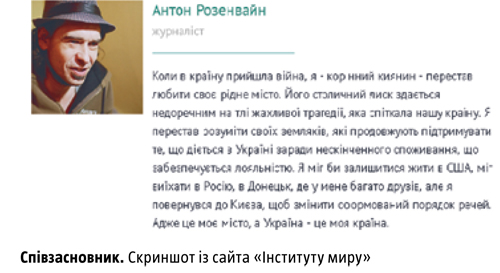 Так, недавно в столице развернула удивительно активную деятельность организация под названием «Институт мира», вокруг которой быстро стали толпиться многочисленные открытые и скрытые адепты «русского мира». Деятельность «Института мира» инспирирована Москвой. И как часто бывает с подобными проектами, его лицами становятся преимущественно политические проходимцы и маргиналы, способные создавать определенный информационный шум, который в отчетах кураторам подается как влияние на общественное мнение.