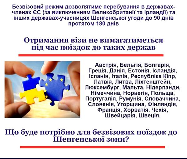 Після запровадження безвізового режиму громадяни України зможуть в’їжджати без віз до всіх держав-членів ЄС (за винятком Великобританії та Ірландії), а також до 4 держав-асоційованих учасниць Шенгенської угоди: Ісландії, Ліхтенштейну, Норвегії та Швейцарії.