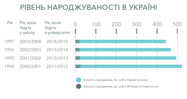 По мнению председателя Ассоциации частных вузов и ректора Европейского университета, Ивана Тимошенко, количество выпускников за пять лет сократилось примерно в два раза. "Сейчас мы видим, что в детских садах и в 1-4 классах перебор детей, а вот в старших – наоборот. К 2020 году эта ситуация выровняется", - рассказал "Стране" Тимошенко.