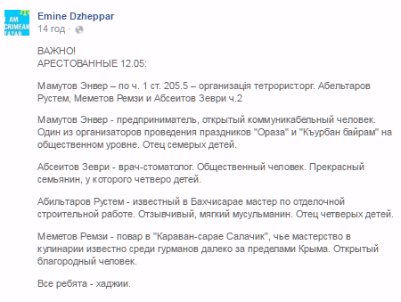 Сначала «прокуратура» Крыма возбудила уголовное дело против заместителя председателя Меджлиса Ильми Умерова за призывы к изменению территориальной целостности России. Ранее он говорил, что крымские татары не признают власть России на полуострвое. В этот же день в Крыму задержали еще четверых крымских татар, выдвинув им обвинение за участие в якобы террористической организации «Хизб ут-Тахрир». По этой статье за решеткой находятся уже 14 человек.