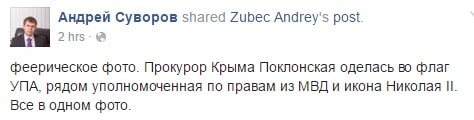 "Поклонская после скандала с Николаем II решила реабилитироваться и вырядилась во флаг УПА, но, чтоб не сильно бросалось в глаза, одела его вверх ногами", - прокомментировал фото пользователь Henadzi Faryno.