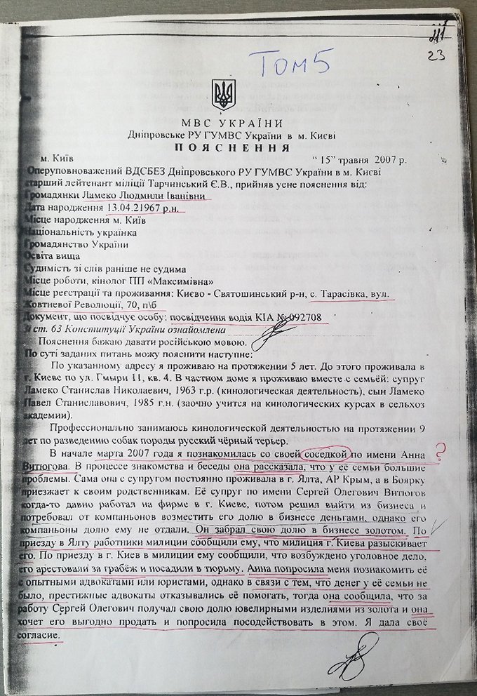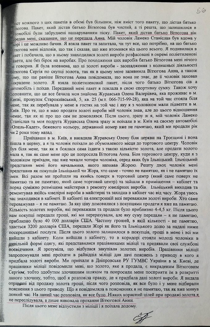 В частности, последующие пояснения, которые давала правоохранительным органам Людмила Ламеко, сводятся к тому, что она, якобы, просто была посредником в попытке продать ювелирные изделия Витюгова.