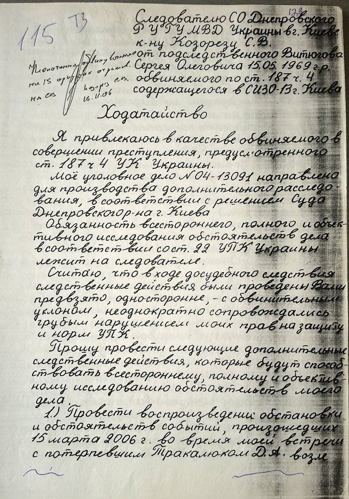 Находясь в заключении, он, осознавая, что бывшие «друзья» о нем не забыли, всячески пытался привлечь внимание правоохранителей к существующему незаконному «ювелирному бизнесу». В частности, еще в 2006 году, в апреле во время допроса он заявил о фактах угроз со стороны сотрудников милиции, а также о готовности раскрыть всю схему уголовного «бизнеса».