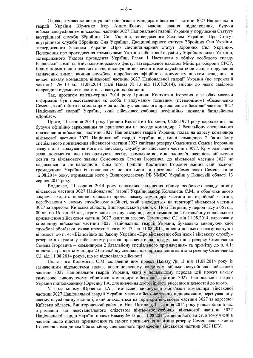 Однако 11 августа 2014 года Гришин Константин Игоревич, 06.06.1974 года рождения, не будучи официально зачисленным и назначенным на должность командира 2-го батальона специального назначения воинской части 3027 Национальной гвардии Украины, подал в адрес командира воинской части 3027 Национальной гвардии Украины от имени командира 2-го батальона специального назначения воинской части 3027 капитана резерва Семенченко заявление о зачислении его на военную службу в воинской части 3027. Кроме указанного заявления, документы, подтверждающие личность, гражданство, состояние здоровья, наличие военного образования и воинского звания Семенченко Семена Игоревича, в воинскую часть 3027 не предоставлялись и не поступали. Кроме того, Гришин Константин Игоревич сменил свой паспорт гражданина Украины с указанием нового имени и фамилии «Семенченко Семен» только 12.08.2014 года, получив его в Вышгородском РО УМВД Украины в Киевской области 13 августа 2014 года...