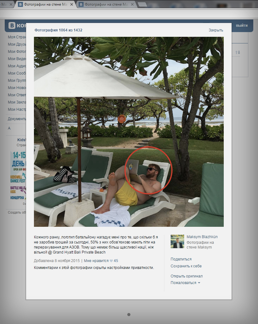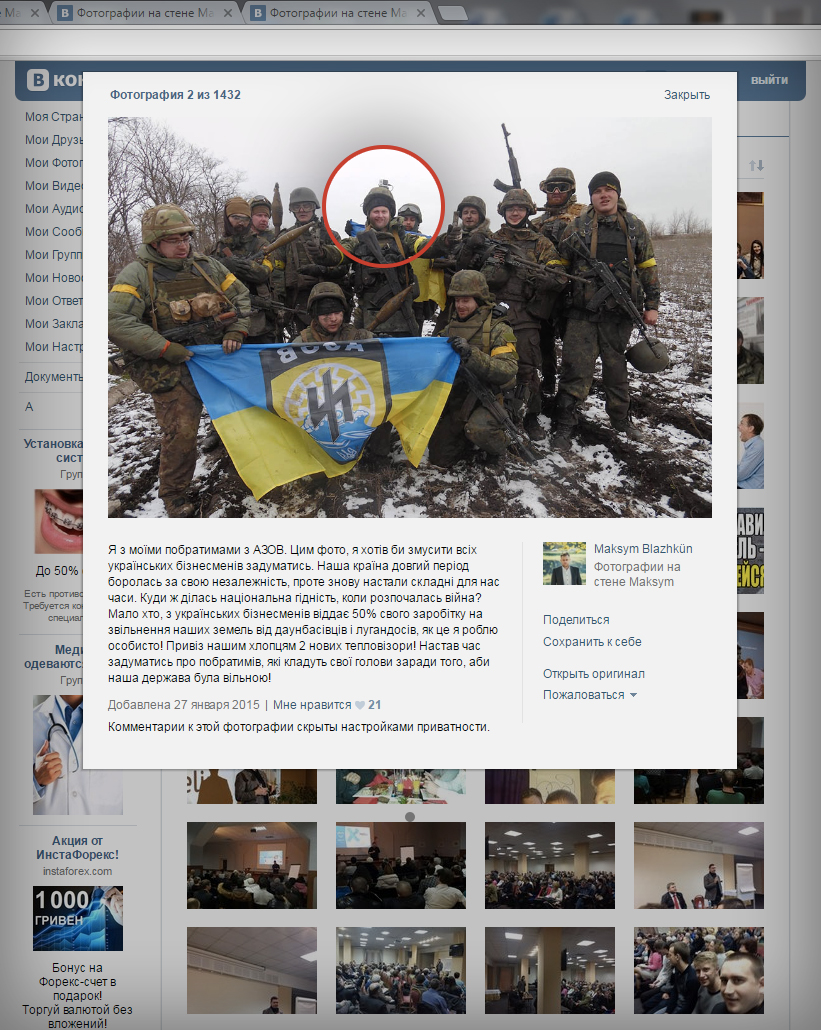 Тепер він намагається побудувати нову піраміду обманюючи довірливих вкладників. Вся піар-кампанія Блажкуна була побудована на тому, що він допомагає АТО. Максим неодноразово публікував пости на своїй сторінці Вконтакті, а також ми знайшли фактичне підтвердження в мережі інтернет. Поки Максим не прийняв рішення виходити на російський ринок зі своїм новим проектом, буквально кожна п’ята його фотографія була присвячена «побратимам з АЗОВа». Тільки уявіть собі, це благочестиве дитя, абсолютно без докорів сумління козиряло тим, що виділяє 50% свого заробітку на війну на Донбасі! Обчистив значить народ і раптово став миротворцем! Хочемо продемонструвати Вам деякі підписи до фото, які обурили всю редакцію.