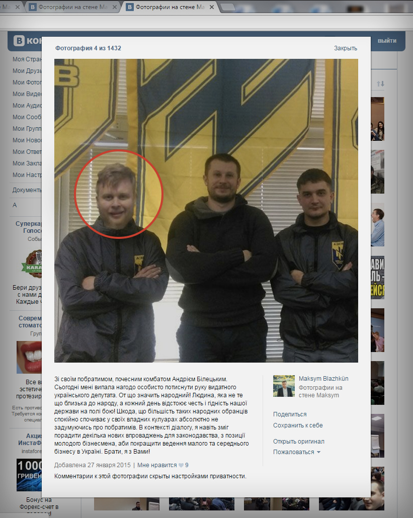 Сьогодні мені випала нагодо особисто потиснути руку видатного українського депутата. От що значить народний! Людина, яка не те що близька до народу, а кожний день відстоює честь і гідність нашої держави на полі бою! Шкода, що більшість таких народних обранців спокійно спочиває у своїх владних кулуарах абсолютно не задумуючись про побратимів. В контексті діалогу, я навіть зміг порадити декілька нових впроваджень для законодавства, з позиції молодого бізнесмена, аби покращити ведення малого та середнього бізнесу в Україні. Брати, я з Вами!».