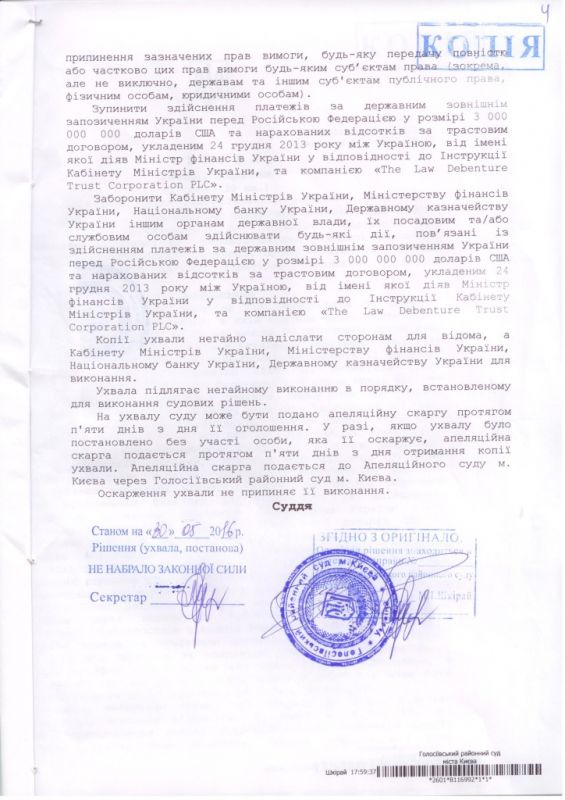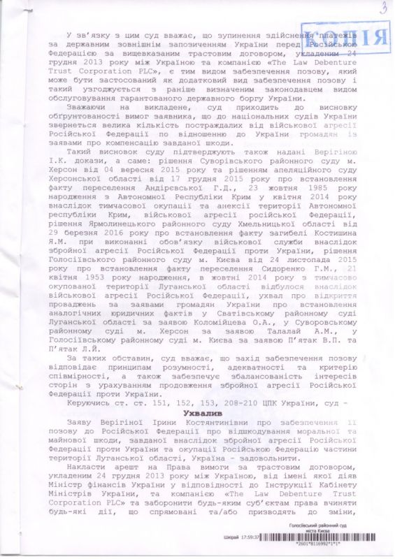 Український суд заарештував 3 млрд доларів російського кредиту. ДОКУМЕНТ