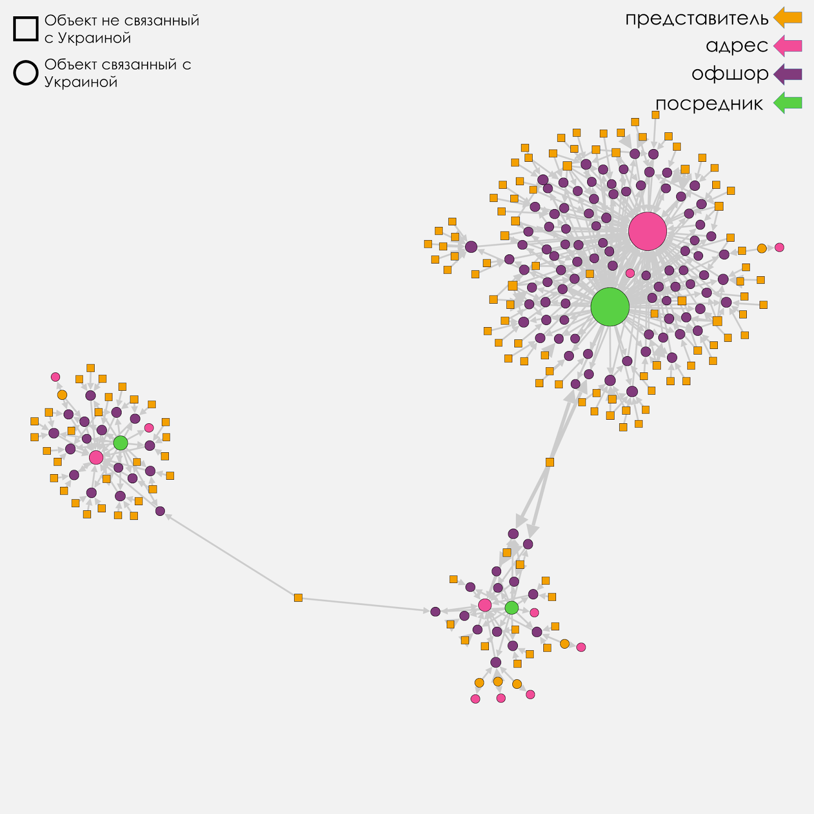 Четыре типа узлов делятся на две группы: узлы, которые связаны с Украиной (представители, адреса и посредники, которые зарегистрированы в Украине) и узлы “внешнего мира” (представители, адреса и посредники, которые зарегистрированы за пределами Украины).