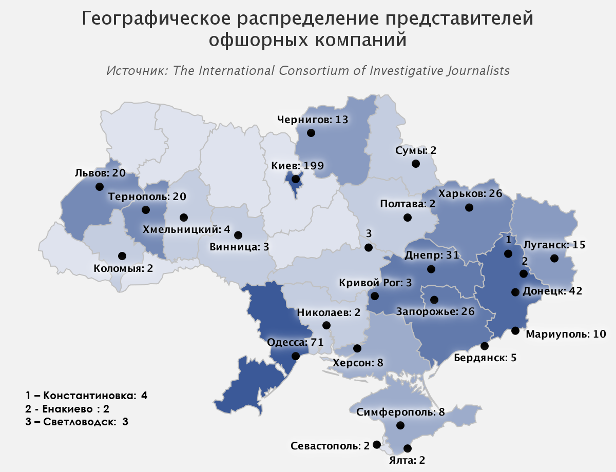 Если вынести за скобки г. Киев, то общая картина такова, что юго-восток Украины гуще заселен представителями офшоров, чем центр и запад. Однако на западе тоже имеются свои два центра - Львов и Тернополь.