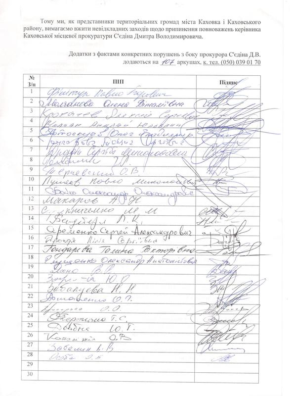Депутаты Каховского городского и районного советов совместно с депутатами Херсонского областного совета, избранными от города Каховка и Каховского района, направили на имя губернатора Херсонской области Андрея Гордеева, председателя областного совета Андрея Путилова, депутатов областного совета и прокурора Херсонской области Сергея Ромась обращение с требованием принять неотложные меры по прекращению полномочий руководителя Каховской местной прокуратуры Съедина Дмитрия Владимировича.