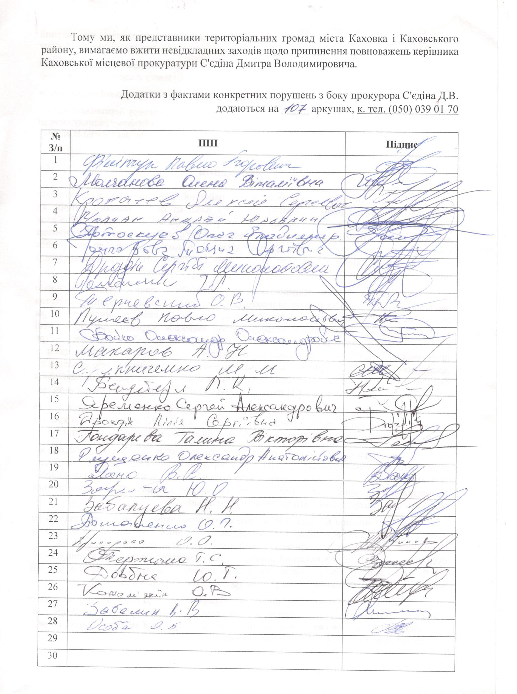 Такие действия и позиция Сьедина Д.В. как руководителя правоохранительного органа, задачей которого является усиление правопорядка и защиту от неправомерных посягательств, крайне возмущают жителей территориальных общин и набрали большого негативного резонанса в обществе. Поэтому дальнейшее пребывание на должности прокурора Сьедина Д.В. может спровоцировать социальный конфликт, который приведет к самоуправляемых, неконтролируемых действий общественности. Сегодня ситуация вокруг руководителя Каховской местной прокуратуры недопустима и требует безотлагательного решения.