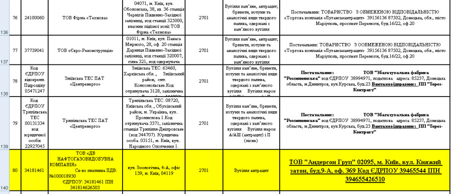 Об ООО «Торговый дом «Энергосбыт» известно, что она была зарегистрирована в апреле 2015-го под названием «Мавер-Аудит», и по одному адресу с ней находится еще одна сомнительная компания, которая называется ООО «Дантрейд ЛТД». Эта фирма имеет такой же уставной капитал – 1000 грн., и тоже получила от «Центрэнерго» договор на поставку угля из АТО на сумму 104 миллиона гривен. Фирма, созданная в конце 2014 года, после заключения договора с «Центрэнерго» была записана на киевлянина Николая Власенко, но основательницей была Оксана Михайловна Горностаева из Красного Луча. Вот этот адрес: г. Киев, улица Олевская 3-Б, офис 1 и офис 1-а. Только там нет никаких офисов – это одноподъездная секция панельного дома на самой окраине Киева, которую арендовала переселенка из Красного Луча. Причем, первый директор«Дантрейд ЛТД» Оксана Горностаева еще в сентябре 2014 года искала работу бухгалтером за 6000 грн. в месяц, а уже через год в качестве Фунта стала ворочать сотнями миллионов…