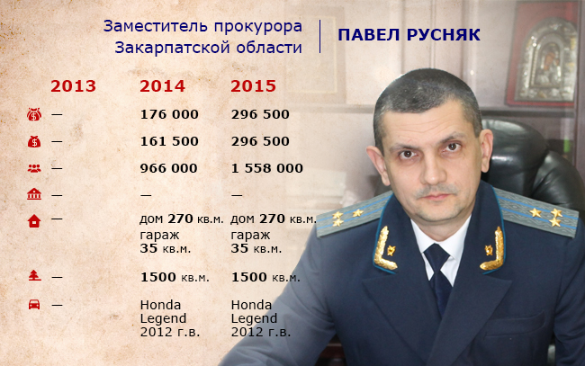 В 2015 году Павел Русняк свои заработки увеличил вдвое. За минувший год он заработал 296,5 тыс. гривен. Это ничто по сравнению с доходами членов его семьи, которые подвели итоги 2015 года настоящими миллионерами. 1 млн 558 тыс. гривен – такой суммарный доход членоы семьи прокурора. Большая часть этой суммы – 1 млн 394 тыс. гривен – получены от предпринимательской деятельности, которая, судя по всему, процветает. Еще 149 тыс. гривен получены от продажи имущества. И 14,5 тыс. – других доходов.