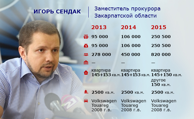 Сендак весь прошлый год жил только на зарплату в 106 тыс. грн., а вот в 2013-м году его зарплата была почти на 10 тыс. грн. ниже, - он получал 95 тыс. грн. в год. Выросли и доходы семьи прокурора в прошлом году: заработок составил 450 тыс. грн. от предпринимательства, это при том, что еще два года назад доход не превышал 278 тыс. грн.