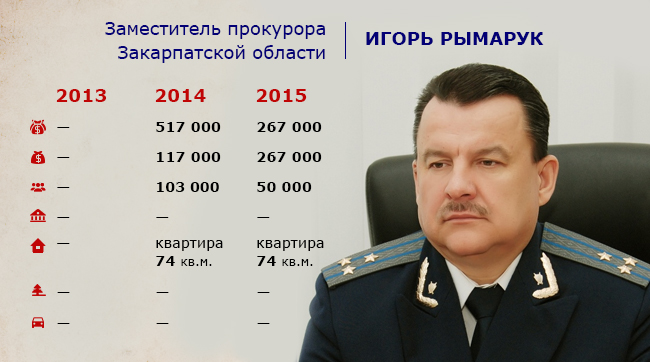 В 2015-м Рымарук вовсе не бедствовал и за минувший год задекларировал 167 тыс. гривен суммарного дохода, который полностью состоит из заработной платы. Супруга прокурора получила 50 тыс. гривен в качестве заработной платы.