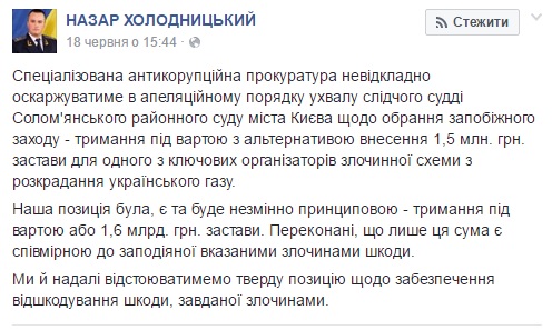 Об этом в эфире сообщил прокурор специализированной антикоррупционной прокуратуры Владимир Кривенко. По его словам, по этой причине было принято решение установить общую сумму залога десяти подозреваемым в размере ущерба 3 млрд грн, нанесенного государству в результате разоблаченной газовой схемы. В отношении семи лиц прокуратура просит суд установить сумму залога 200 млн грн, двоим 250 млн и одному, соорганизатору преступной организации 1 млрд 600 млн грн.