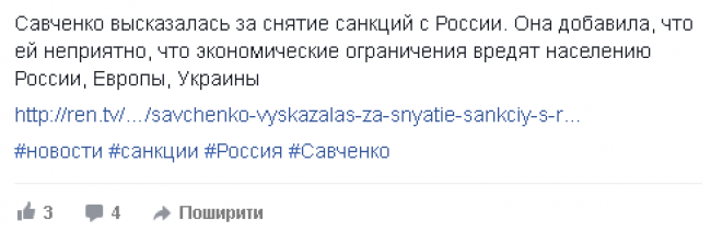 «Я предлагаю вспомнить, ведь буквально пару месяцев назад о Савченко в российских СМИ писали только как о члене националистического батальона, которая убила российских журналистов. Сейчас ситуация поменялась и, более того, ее сообщения расхватывают на цитаты российские СМИ. Еще какое-то время пройдет, и Савченко, как и Кадыров станет моральным авторитетом в российских мас-медиа. Или еще пример: пару недель назад российские СМИ сообщили о том, что Украина перестала поставлять в Россию жизненно необходимый медицинский препарат. Хотя просто частное предприятие, которое его производит в Украине, не сошлось в цене с российским потребителем. Но подали это так, что «хунта», «фашисты» не поставляют жизненно необходимый препарат в Россию», – говорит Дейниченко.