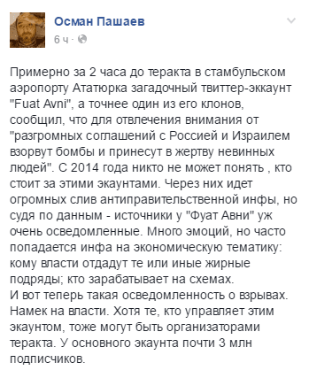 "Примерно за 2 часа до теракта в стамбульском аэропорту Ататюрка загадочный твиттер-эккаунт "Fuat Avni", а точнее один из его клонов, сообщил, что для отвлечения внимания от "разгромных соглашений с Россией и Израилем взорвут бомбы и принесут в жертву невинных людей", - написал он.