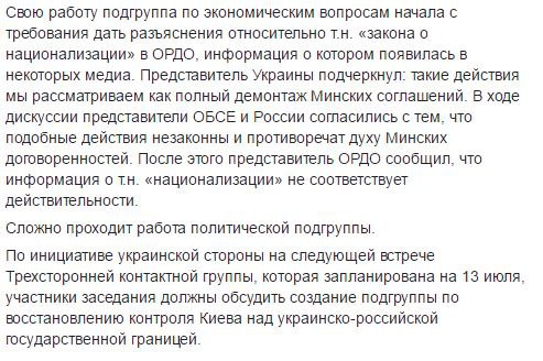 Об этом 29 июня сообщила пресс-секретарь представителя Украины на переговорах в Минске Дарка Олифер на своей странице в Facebook.