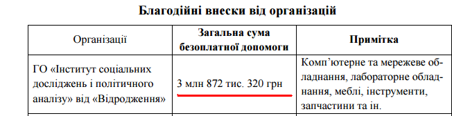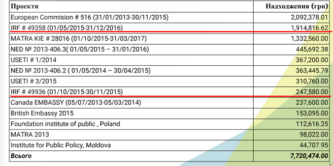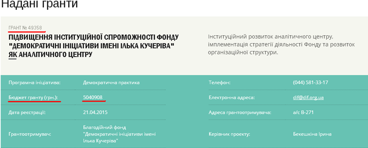 По этому номеру в отчете самого фонда "Демократические инициативы" мы можем увидеть, что из 5-миллионного гранта фонд отразил получение только 1,9 млн. грн. Также здесь можно увидеть, что основными донорами фонда являются Еврокомиссия, посольства Нидерландов (программа MATRA), Канады, Британии, а также американский околоправительственный Фонд поддержки демократии (NED):