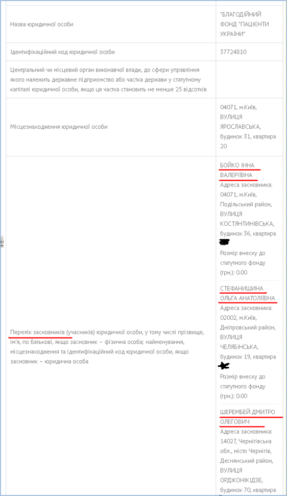Согласно данным Единого госреестра, учредителями БФ "Пациенты Украины" являются Инна Бойко, Ольга Стефанишина (она также и руководитель фонда) и Дмитрий Шерембей:
