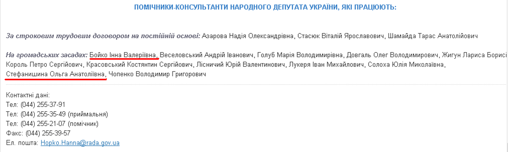 Инна Бойко и Ольга Стефанишина, согласно данным сайта Верховной Рады, являются помощниками народного депутата Анны Гопко, которая под номером 1 прошла в парламент по списку партии "Самопомощь" (правда, ее уже исключили из фракции за голосование за изменение в первом чтении в Конституцию по децентрализации и особому статусу Донбасса):