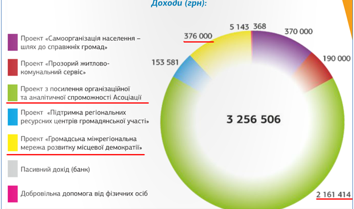 Также 200 тыс. получила киевская ячейка этой ассоциации на "Программу развития местной демократии в столице". Согласно отчету ассоциации, почти 78 % доходов за 2015 год ассоциация получила от проектов, финансируемых МФВ: