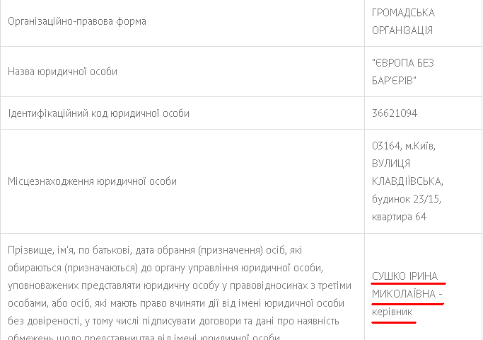Здесь интересен тот факт, что согласно сведениям Единого реестра юридических лиц и физлиц-предпринимателей, руководителем общественной организации "Европа без барьеров" является Ирина Сушко: