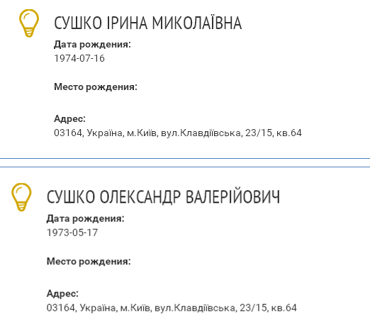 Являются ли Александр и Ирина Сушко просто однофамильцами, или родственниками, или супругами? Согласно данным одной из баз жителей Украины, они, возможно, проживают вместе – по адресу, который совпадает с адресом регистрации общественной организации "Европа без барьеров":