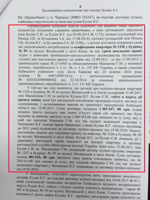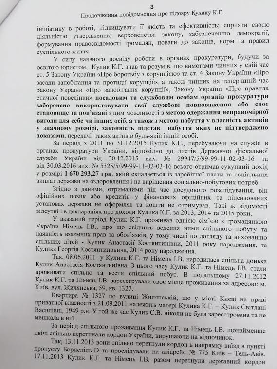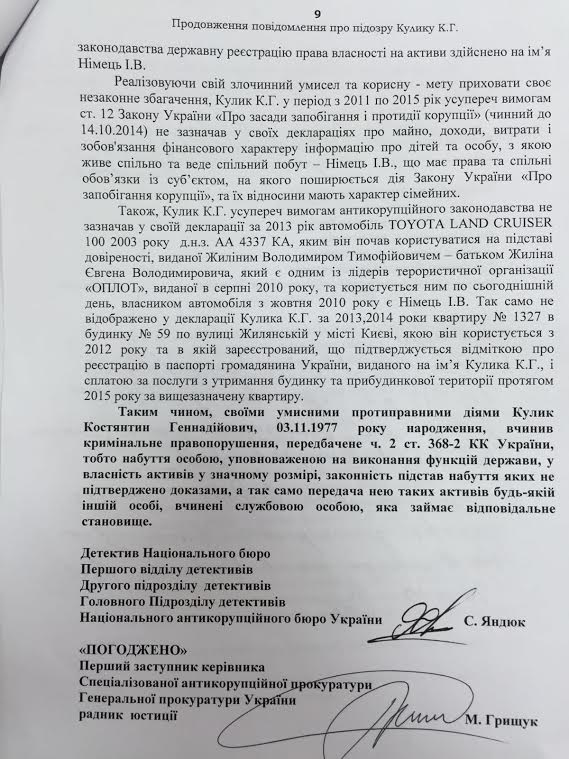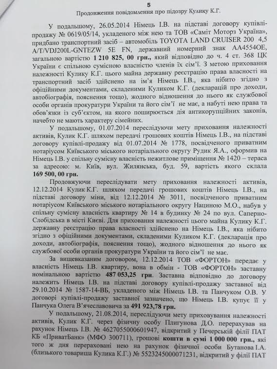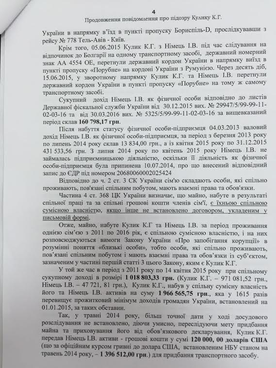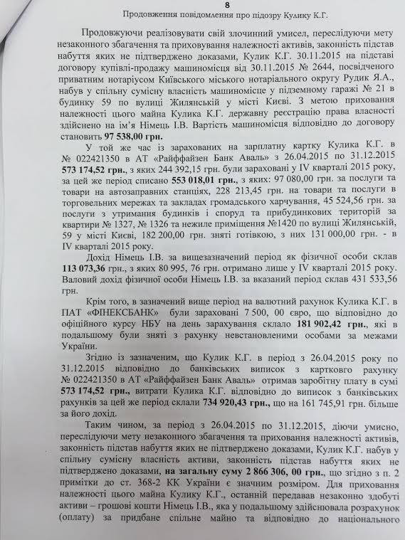 «В период с 2011 года по 14 апреля 2015 при совместном совокупном доходе в размере 1018 803,33 Кулик получил в общую совместную собственность его и Немец активов на сумму 1966 565,75 грн», - отмечается в подозрении.