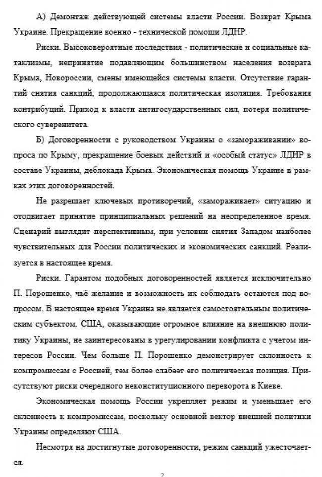 Риски. Высоковероятные последствия – политические и социальные катаклизмы, непринятие подавляющим большинством населения возврата Крыма, Новороссии, смены имеющейся системы власти. Отсутствие гарантий снятия санкций, продолжающаяся политическая изоляция. Требования контрибуций. Приход к власти антигосударственных сил, потеря политического суверенитета.