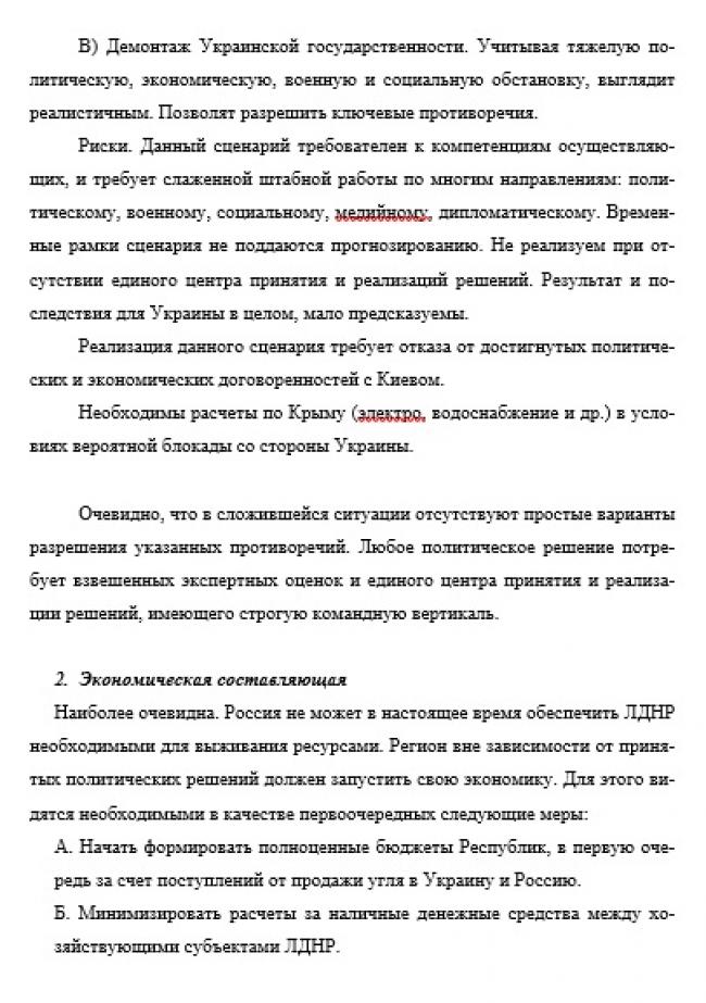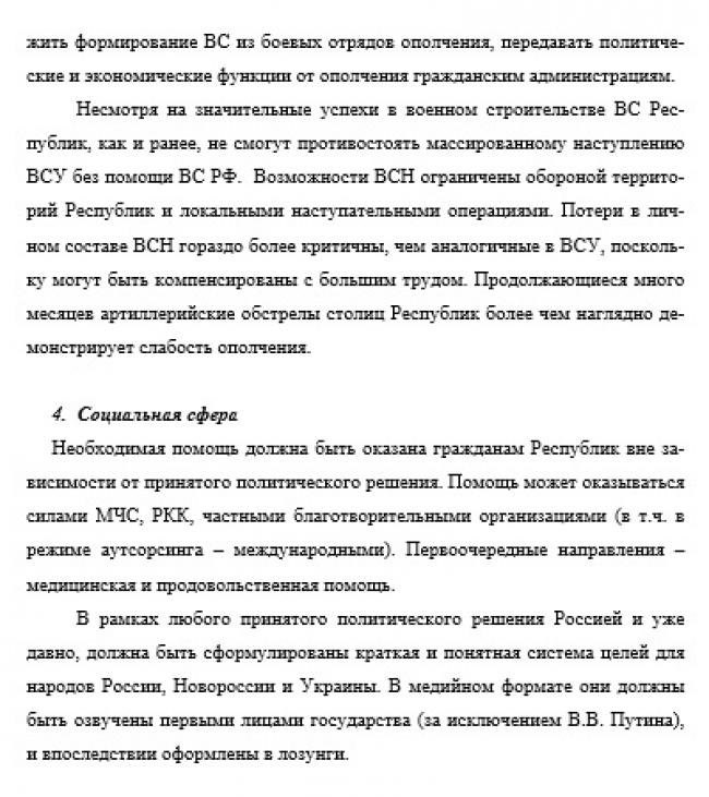 В качестве рисков для варианта с нашим уничтожением называют компетенцию исполнителей и слаженность штабной работы по многим направлениям: политическому, военному, социальному, медийному, дипломатическому.  Среди первоочередных мер названы формирование полноценных бюджетов террористических недореспублик, в первую очередь за счет поступлений от продажи угля в Украину и россию и снятие ограничений на ввоз гуманитарной помощи от организаций и граждан россии. Проблема участия вс рф в боевых действиях на Донбассе является у них наиболее спорным вопросом, военное поражение ополчения – вопросом времени, они предлагают продолжать формировать единую систему командования террористов, в первую очередь – в россии.
