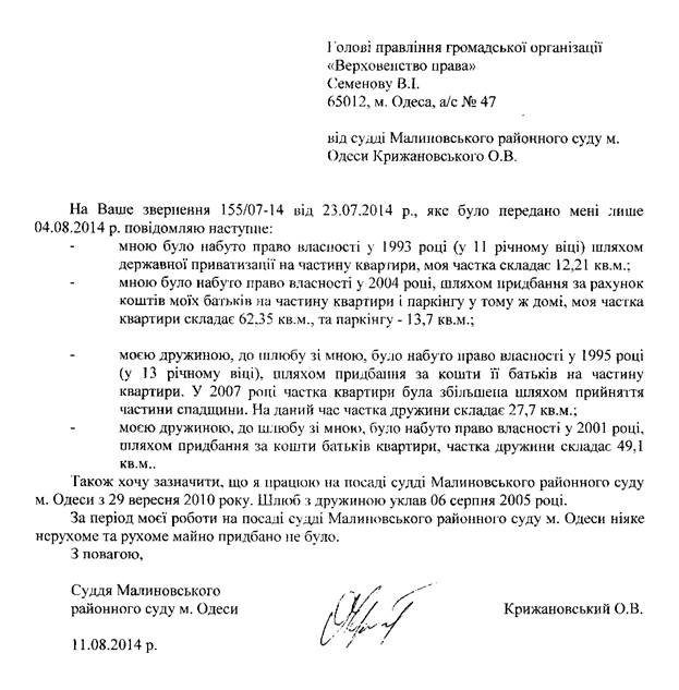 Буквально на днях на электронную почту общественной организации судья Малиновского районного суда г. Одессы Крыжановский О.В. прислал ответ на запрос о происхождении имущества.