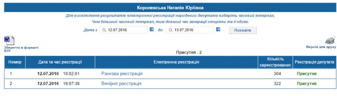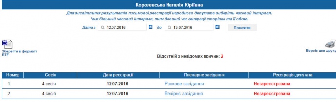 Однако, по данным издания, на сайте Верховной Рады в разделе электронной регистрации отмечается, что карта Натальи Королевской была на утреннем и вечернем заседании 12 июля.