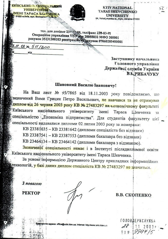 В издании подчеркнули, что, занимая должность первого зампредседателя Перечинской РГА, Петр Грицик закончил КНУ имени Тараса Шевченко по специальности "Экономика предприятия". Однако в ответе тогдашнего ректора университета по запросу ГУ государственной службы Украины отмечается, что чиновник не учился, а также не получал данного диплома.