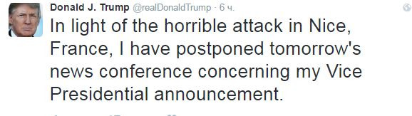 8.27 - Кандидат на пост президента США от Республиканской партии Дональд Трамп из-за теракта в Ницце отложил объявление имени своего кандидата в вице-президенты. "В свете ужасной атаки во французской Ницце я откладываю пресс-конференцию, касающуюся объявления моего кандидата в вице-президенты", —написал Трамп в Twitter.