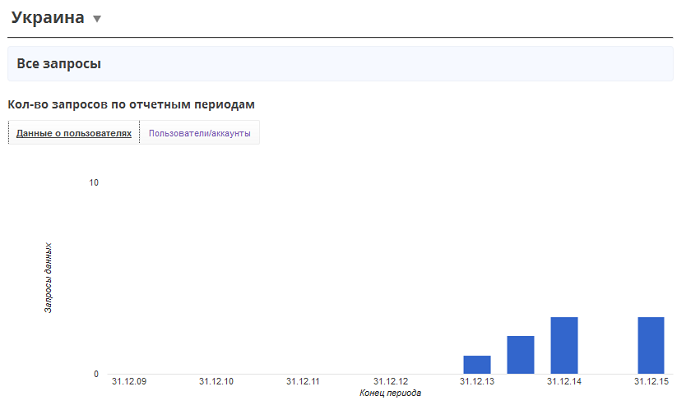 Кроме того, в 2014 году от украинского правительства поступило два запроса на выдачу личных данных 18-ти пользователей, которые Google удовлетворила на 50%. По данным Google, интерес к персональным данным пользователей начал расти, начиная с декабря 2013 года. Во втором полугодии 2013 года был направлен первый исторический запрос, который не был удовлетворен.
