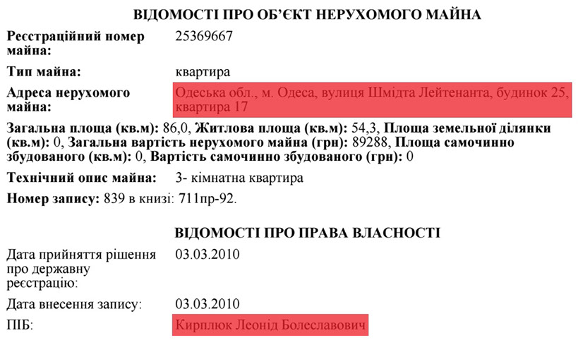 Але є у Людмили Леонідівни також ще й заможний... батько - Кирплюк Леонід Болеславович (Кирплюк - її дівоче прізвище), що також має трикімнатну квартиру в центрі Одеси, в Приморському районі, прямо біля Привокзальної площі.