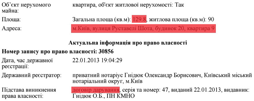 Має Леонід Болеславович також і чималу квартиру в центрі Києва площею майже в 130м²(!) на вулиці Шота Руставелі. Сьогоднішня вартість подібних квартир стартує від просто захмарних 280тис.$(!) (майже 7млн.грн.) Але він її не купував, йому цю квартиру... "подарували" у тому ж таки 2013 році :)))