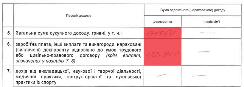 У своїй декларації за 2013р. Кирило Юрійович вказав 171,5тис.грн. сукупного доходу, з яких майже 123тис.грн. - його заробітна плата. Річний дохід його дружини не зазначено в декларації.
