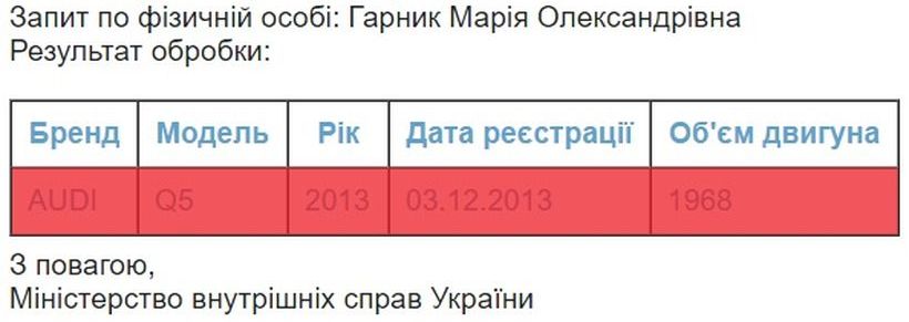 Дружина ж Кирила Юрійовича, Гарник Марія, яка в 2013р. (відповідно до декларації свого чоловіка) не мала доходів та жодної копійки на своїх банківських рахунках, в кінці того ж року придбала також недешеве авто і також німецької марки - AUDI Q5 2.0 2013р., яке на той час коштувало від 50тис.$(400тис.грн.)