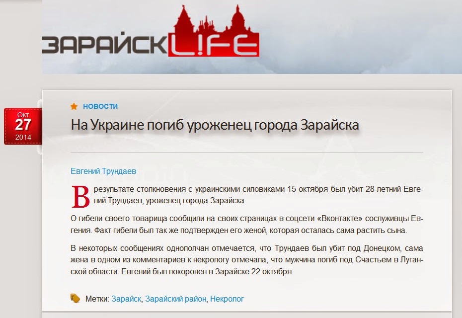 27 октября 2014 года уже на сайте Зарайск L!FE, который специализируется на новостях Зарайска – города в Московской области откуда был родом Трундаев – появилась заметка "На Украине погиб уроженец города Зарайска" о гибели Евгения Трундаева в результате боя с украинскими военными. Позже заметку удалили, но она сохранилась в виде архива кеша поисковика Google.