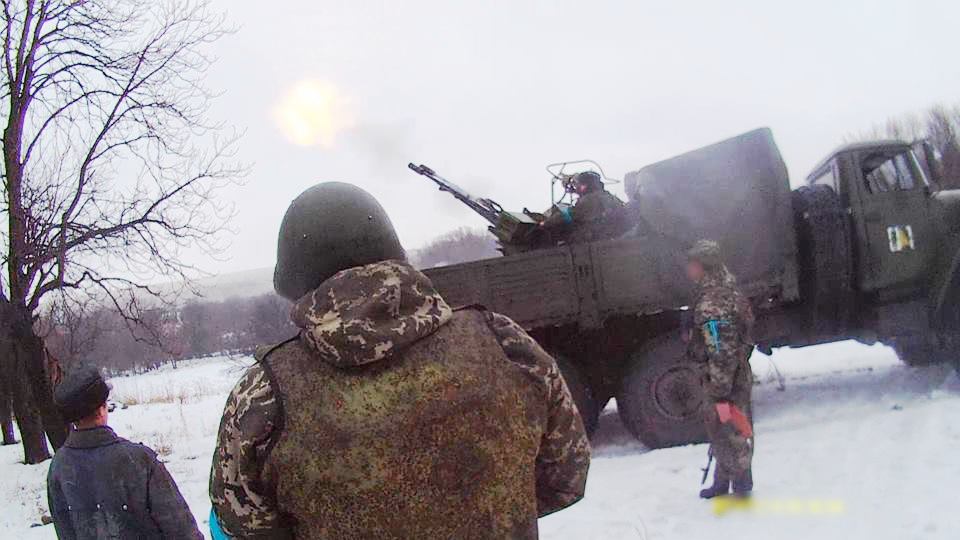 В первые секунды видео "Бои под Дебальцево. Начало наступления", выложенного боевиками, на вводной заставке указывается, что съемки относятся к боевым действиям под Дебальцево 23 января 2015 года. В кадре с 00:17 из кузова армейского "Урала" ведет огонь установка ЗУ-23. На правой двери грузовика под белым номером 01 просматривается небольшой знак желтого цвета: